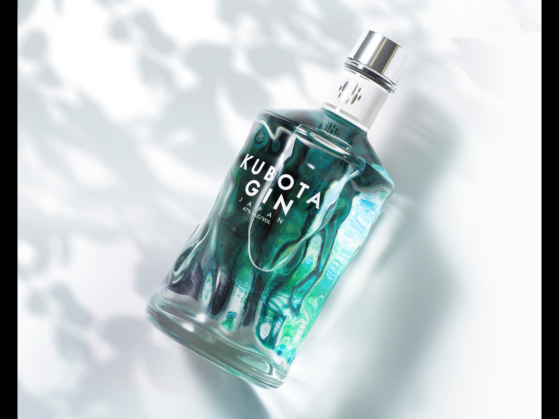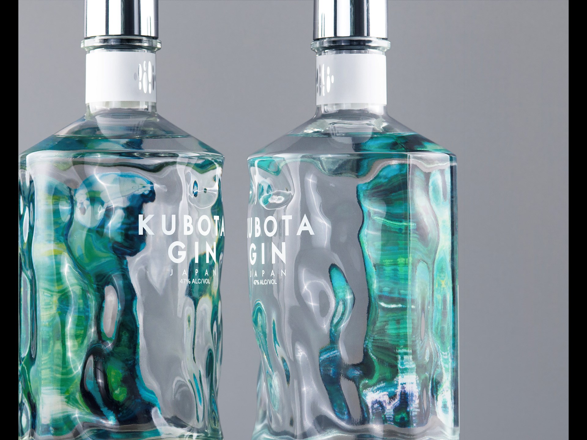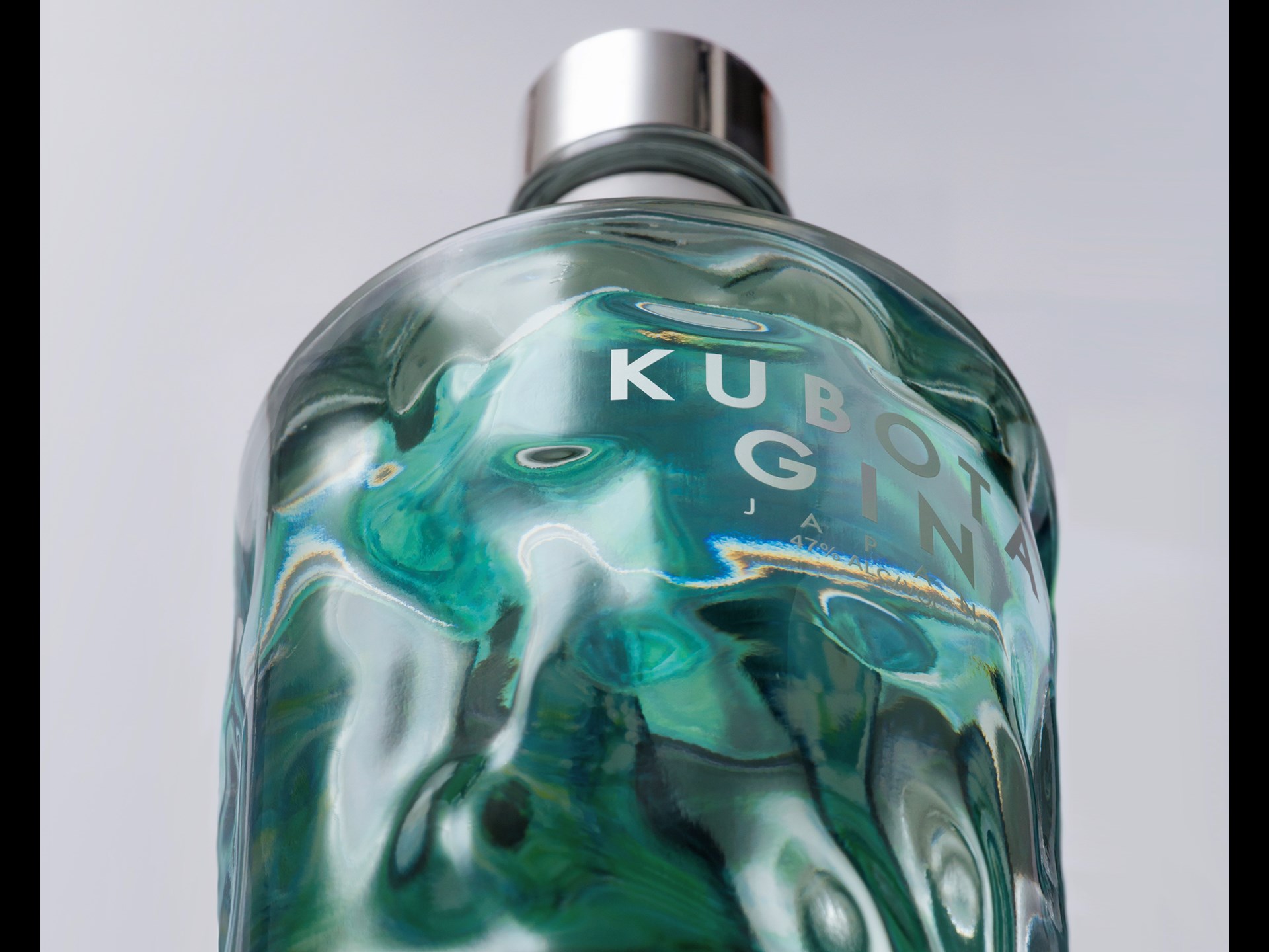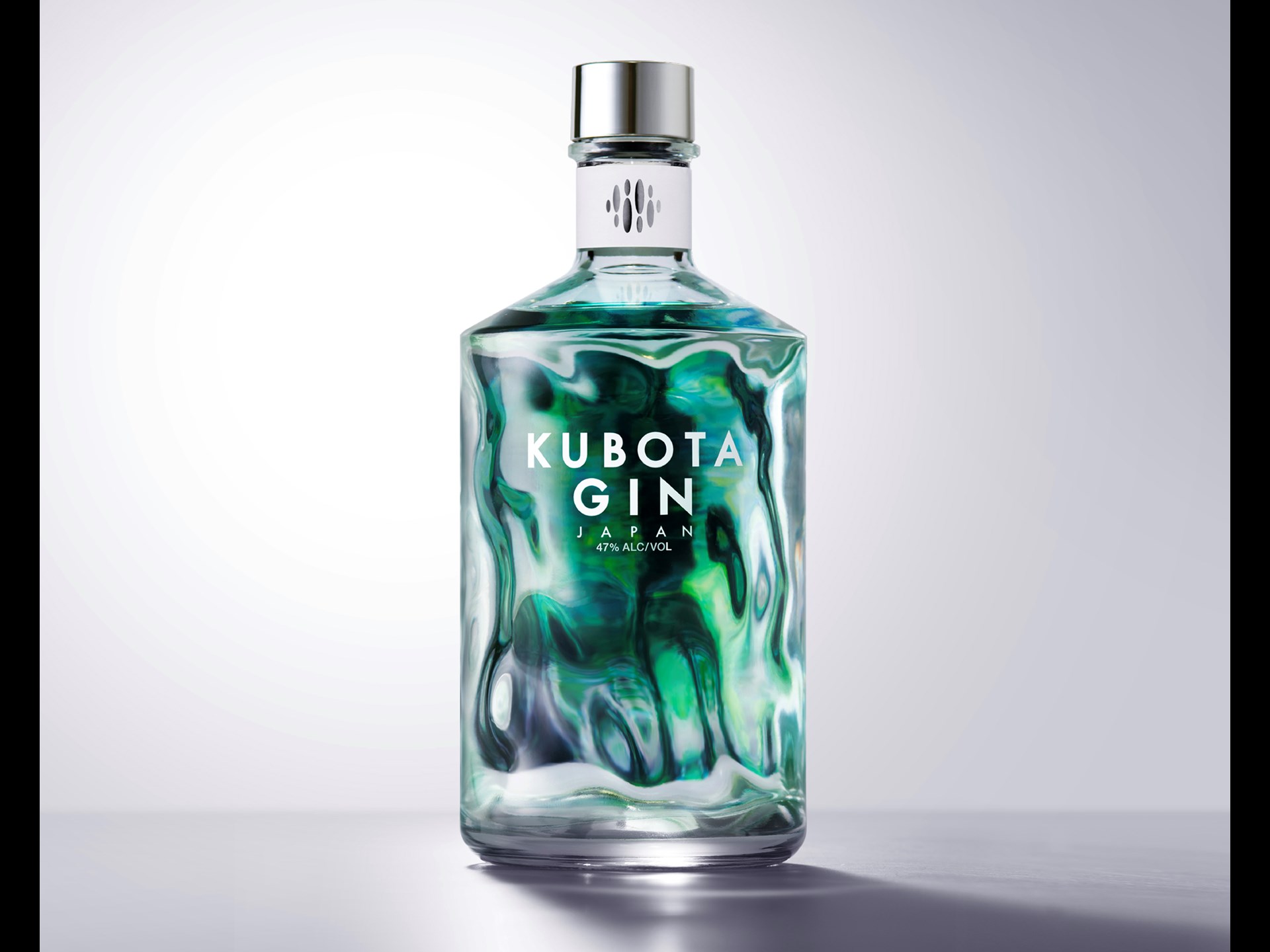 Due to the lens effect, the back-label graphic of trees reflected in water expands to the whole bottle, its appearance also changing as the gin level goes down.