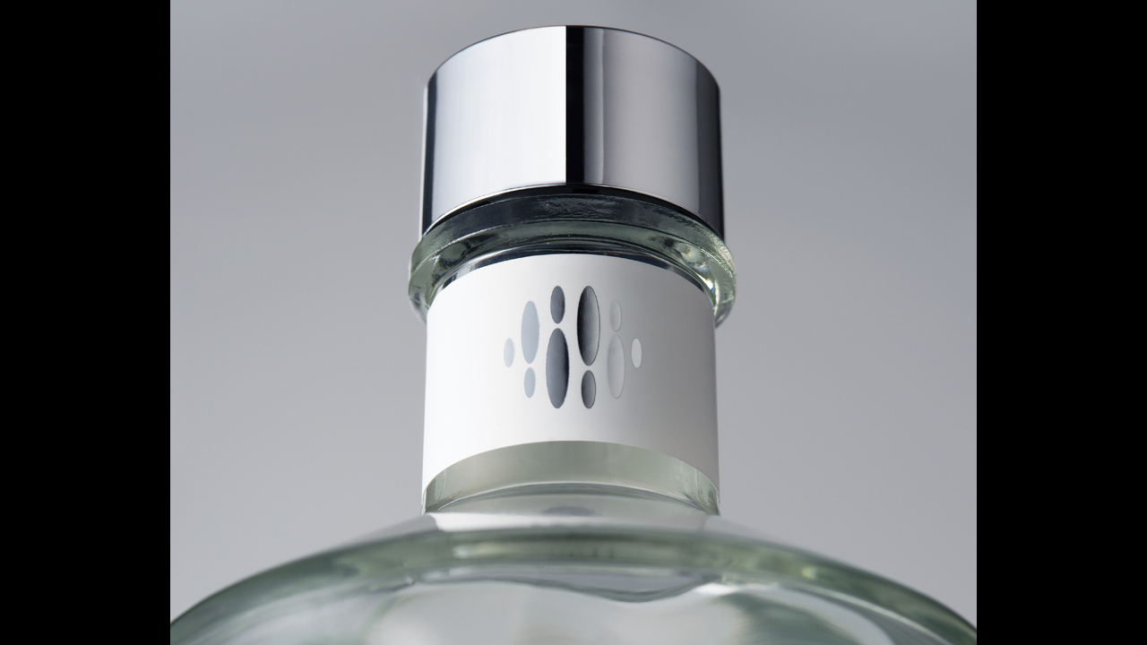 The simple, abstract shape of the brand symbol on the neck label spurs an imaginative response, while the silver mirror surface of both symbol and cap suggests a Japanese sacred mirror that reflects the world and the myriad deities who inhabit it.