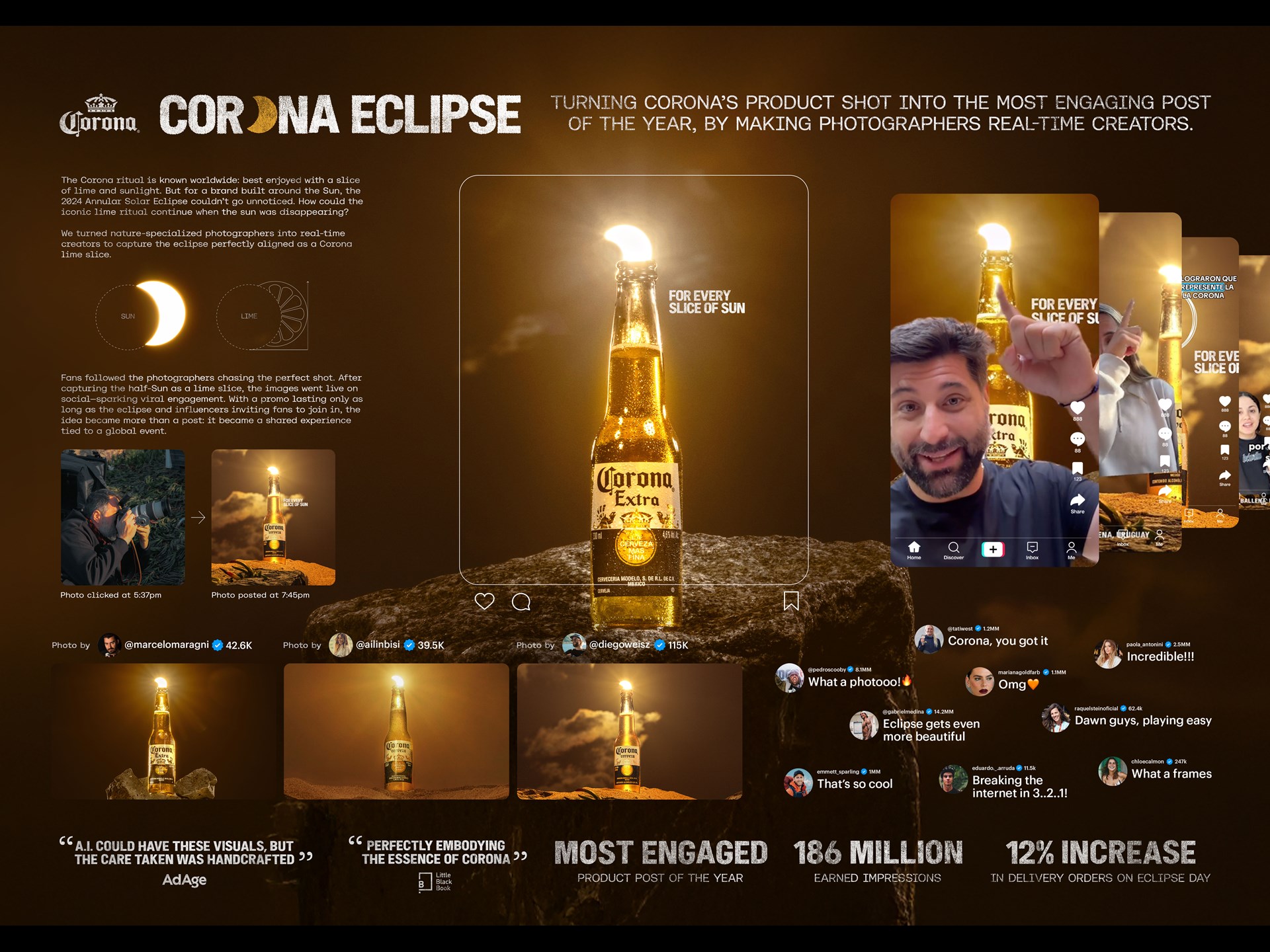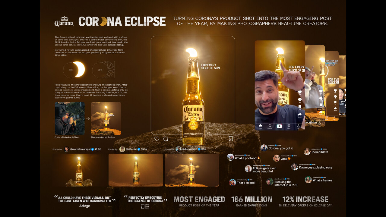 With 186 million impressions and 96% positive sentiment, the work achieved brand metrics and reinforced Corona’s core equity: sunset, lime, and nature. The campaign didn’t just connect with fans, it resonated across nature and science communities.