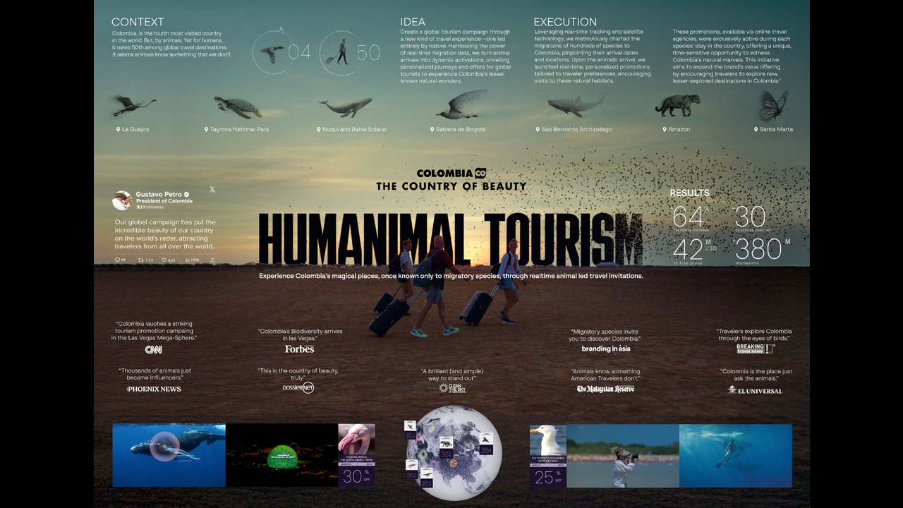 The concept transformed a curious insight into a data-fueled creative system: species became influencers, and their natural routes became a new form of travel recommendation. We didn’t just promote Colombia—we let wildlife guide the world to its hidden beauty. It was instinct, powered by innovation.