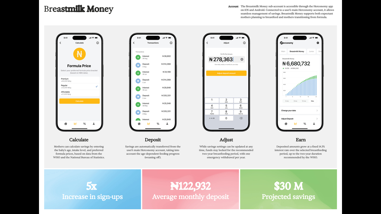 Breastmilk Money showed how data could change perception. It turned breastfeeding into a financial behavior and made women’s invisible contributions measurable, meaningful, and profitable. What was once emotional labor became a visible investment in both health and wealth.