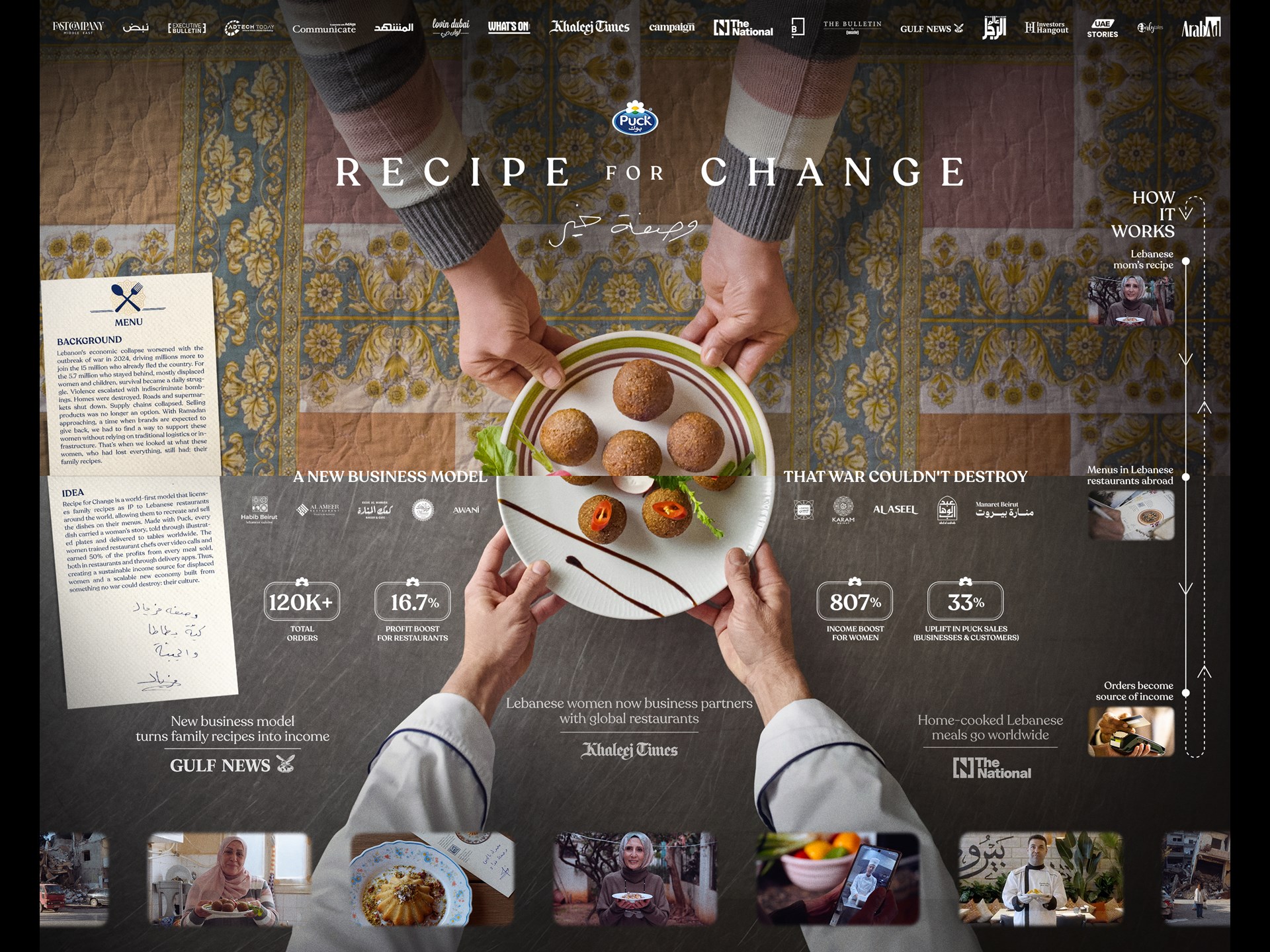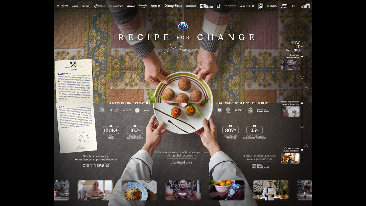 We documented their personal stories and traditional recipes, each made using Puck products, through short films, often shot under dangerous and unpredictable conditions as locations became unsafe without warning. Next, we brought these recipes to Lebanese and fusion restaurant owners in countries like the UAE, KSA, UK, USA, and Australia.