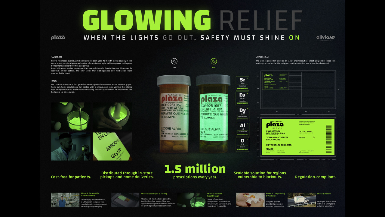 Together, they set out to create a simple, human-centered innovation: Glowing Relief, the world’s first glow-in-the-dark prescription label.
