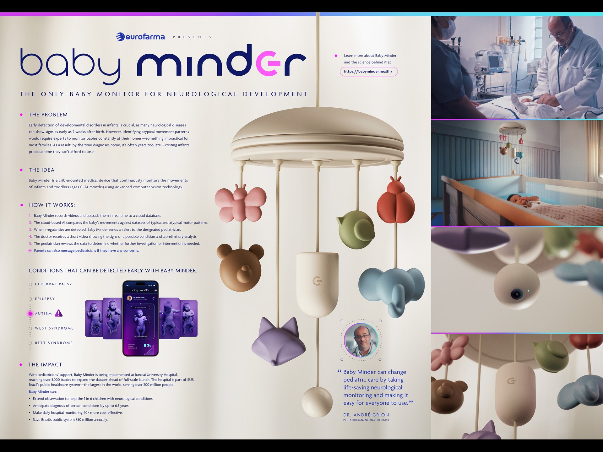 By flagging potential indicators of conditions like epilepsy, autism, cerebral palsy, and dozens more, Baby Minder enables timely interventions based on concrete data, fostering peace of mind for doctors and parents and improving outcomes for infants and toddlers.