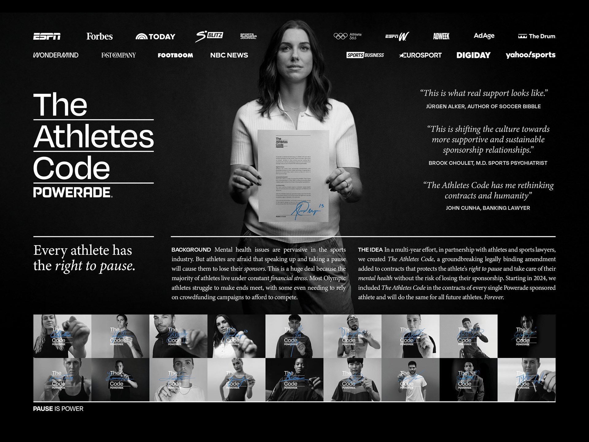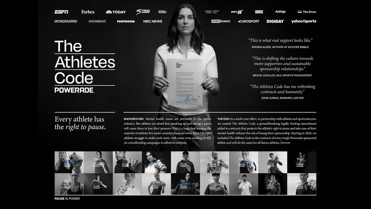 Inspired by athletes who found the courage to step away from competition to focus on their mental health, The Athletes Code transformed “Pause is Power" from a message into a movement. With The Athletes Code, Powerade sent a powerful–and legally binding–message: We protect your mental health as powerfully as your physical health.